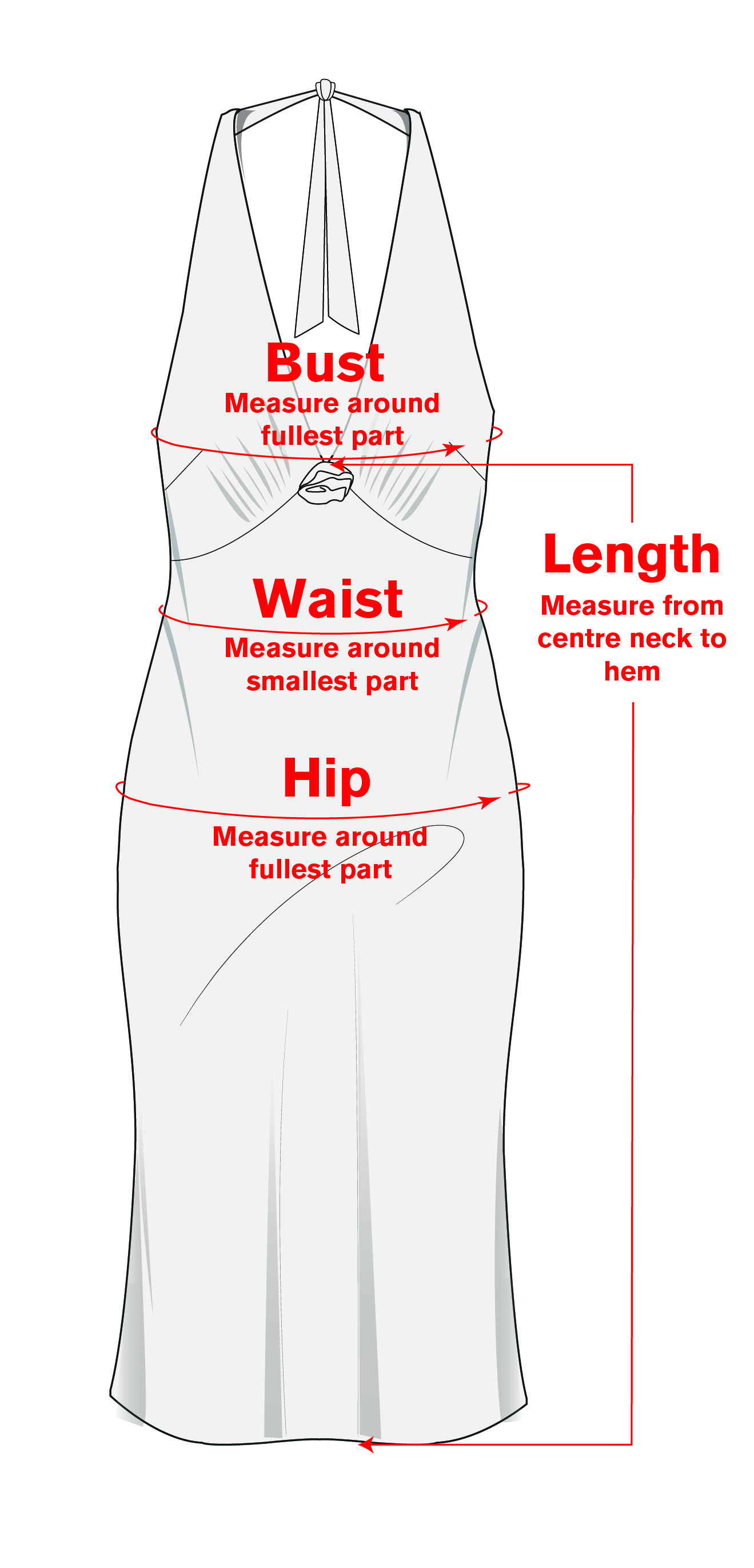 | Size | Bust | Waist | Hips | Length |