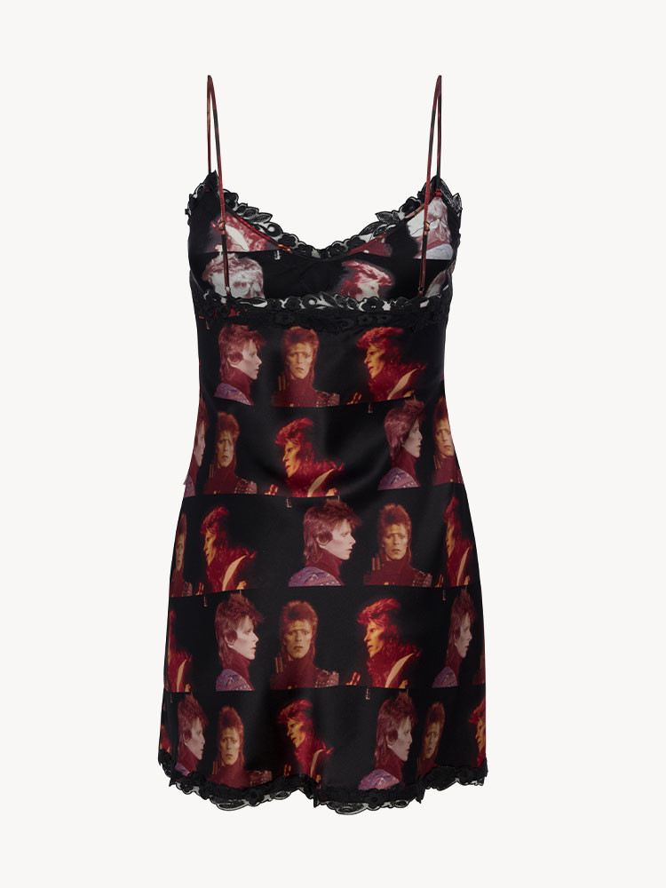 A repeat print that is splashed with Ziggy Stardust and photographed by Masayoshi Sukita. The Sukita Slip here to take you out of the stardust dream and into Bowie reality. She’s silk satin and mini in length, has adjustable straps and a custom lace around the neck and hemlines.